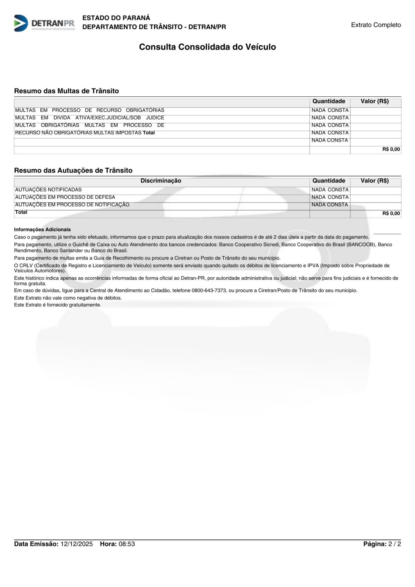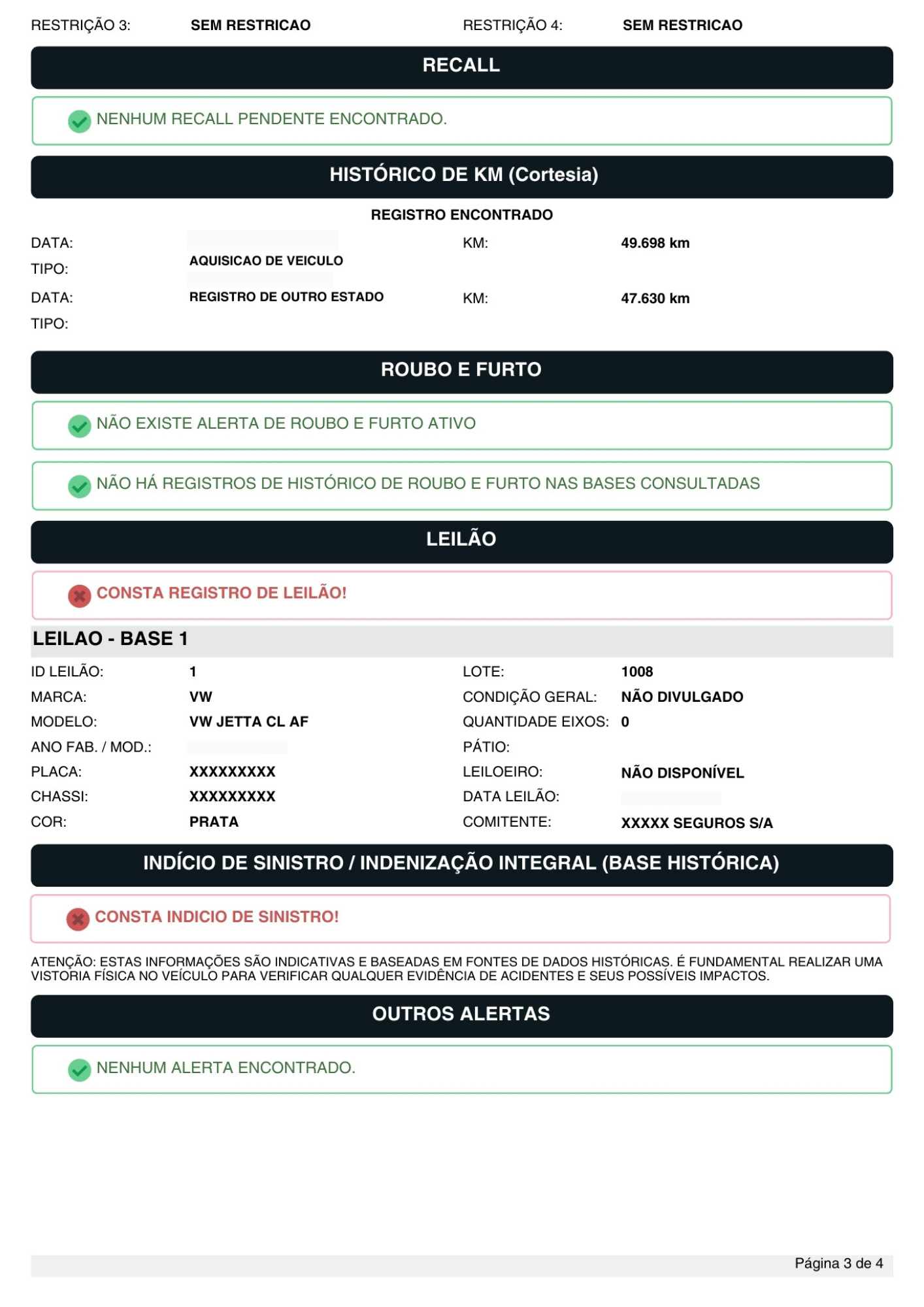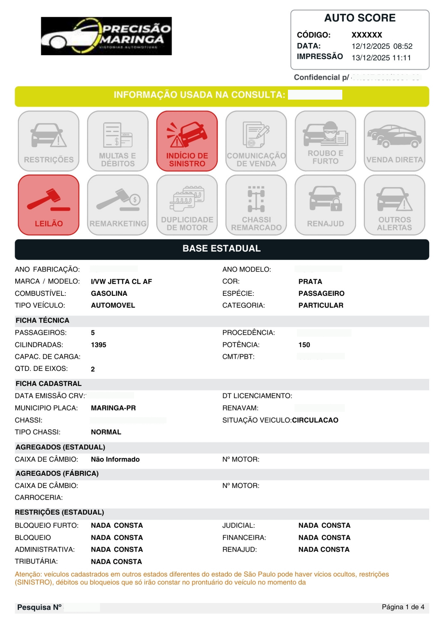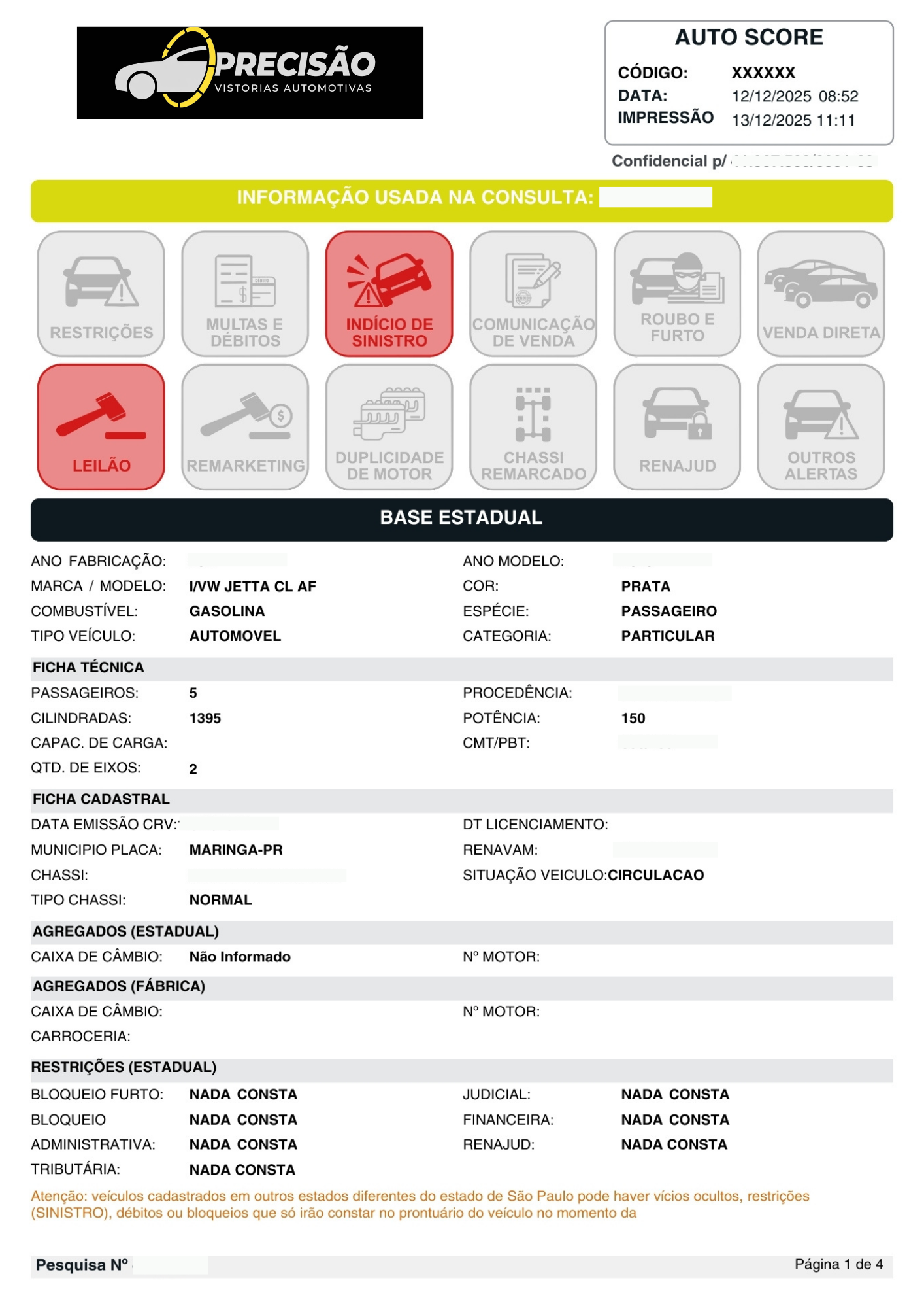 Registro de leilão, sinistros, roubo e furto, restrições administrativas, judiciais (RENAJUD), financeiras, restrição por benefício fiscal (PCD), além de débitos pendentes.