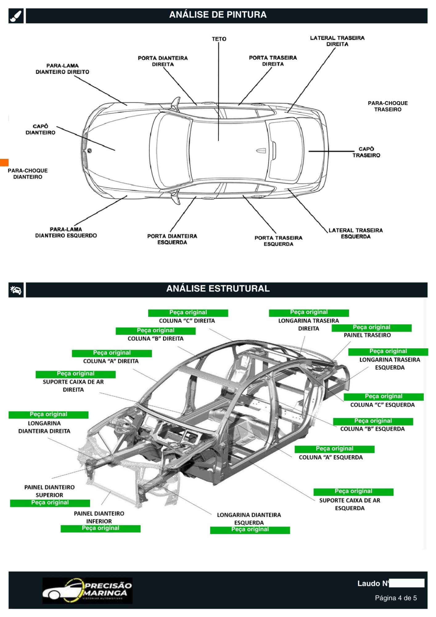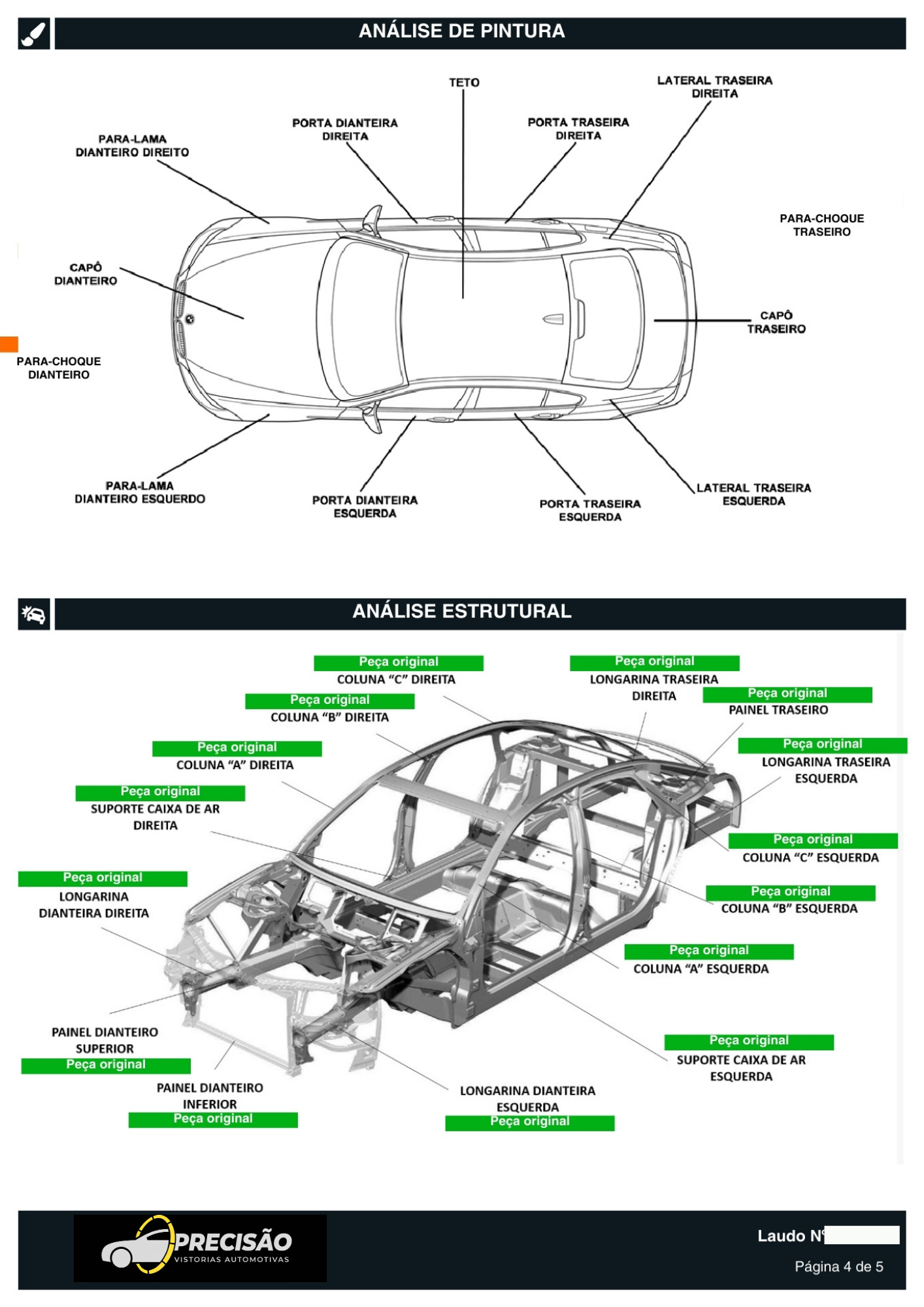 Análise completa de Painéis dianteiros e traseiros, pontos de soldas, cortes, danos na estrutura ou reparos irregulares.